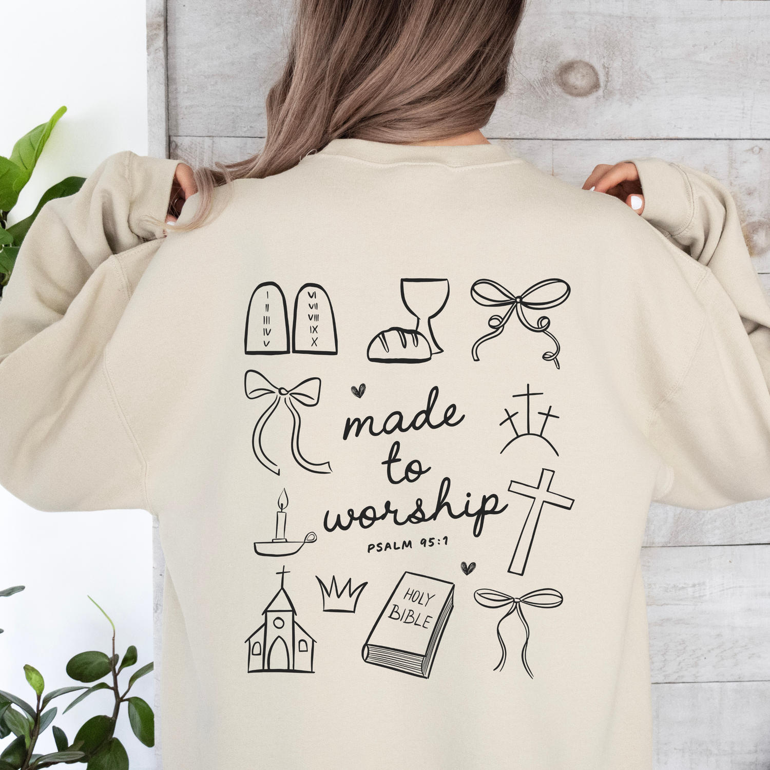 Wear your faith boldly with the “Made to Worship” sweatshirt — a statement piece featuring a graphic of faith-inspired symbols like crosses, a Bible, a chalice, and bows.